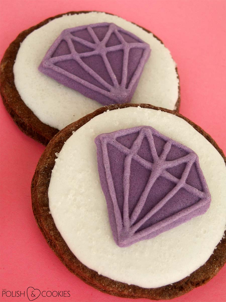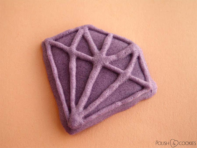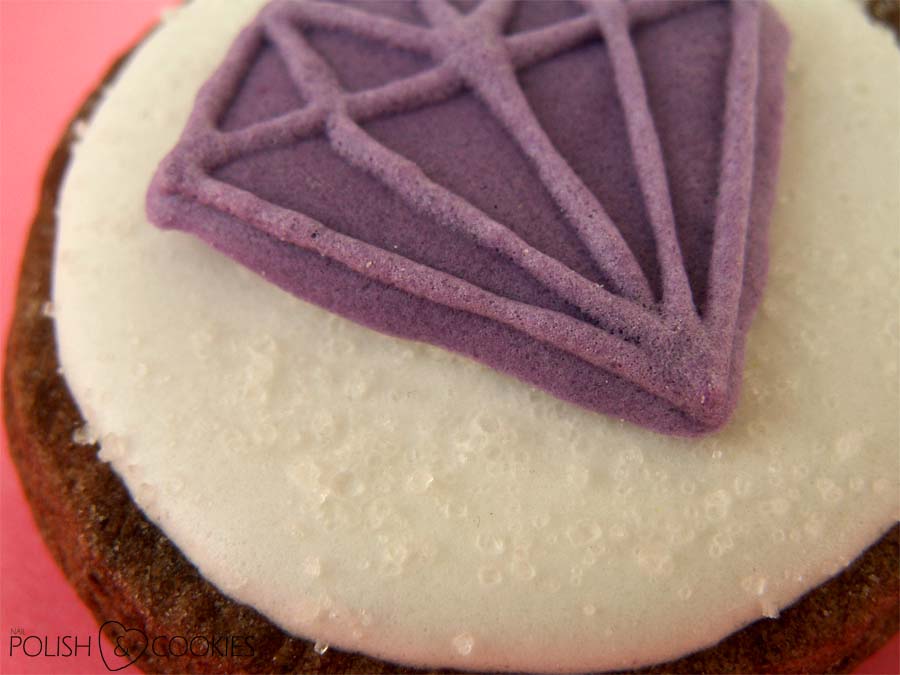 Aby zaoszczędzić sobie trochę czasu, moje diamenciki z fioletowego lukru przygotowałam sobie już wcześniej. O tej sztuczce pisałam Wam przy wykonywaniu moich niedawnych sówkowych ciasteczek – tym razem na papierze do pieczenia namalowałam najpierw kształt diamentów, a kiedy lukier wysechł namalowałam na nich jeszcze dodatkowo kontury „szlifów” przy pomocy cienkiej końcówki do dekoracji ciast i ciasteczek.