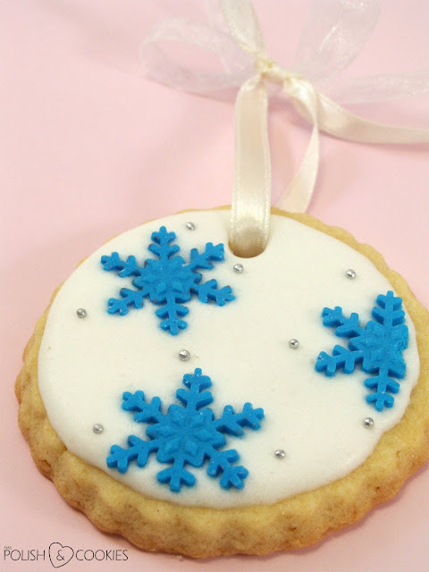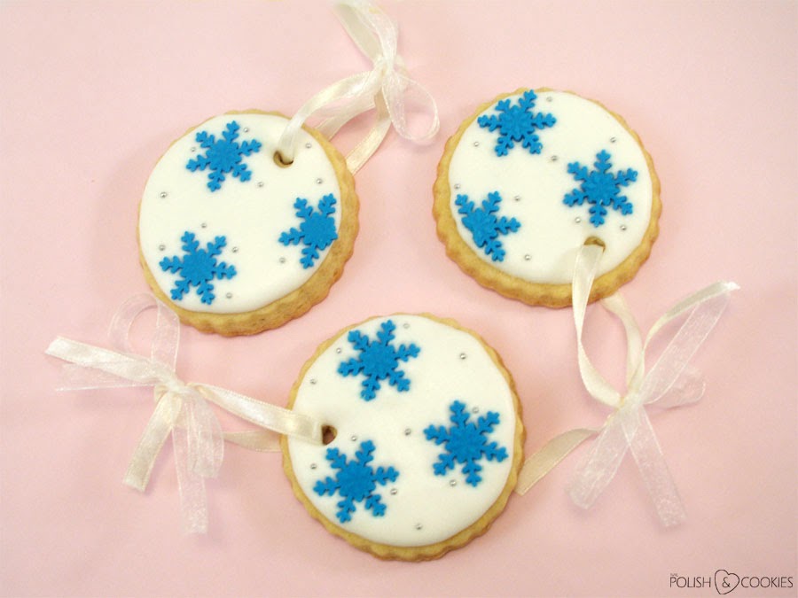 Przy wykonaniu tych pyszności znowu przydała mi się wykrawaczka do masy cukrowej w kształcie płatka śniegu, którą widzieliście w akcji już wcześniej przy TYCH CZERWONYCH CIASTECZKACH. W tym przypadku jednak tło zdobienia wykonałam klasycznym białym LUKREM KRÓLEWSKIM. Od razu na wilgotny lukier przytwierdziłam wycięte z błękitnej masy cukrowej gwiazdeczki oraz maleńkie srebrne perełki cukrowe. Jak widać dodatkowo przed wstawieniem ciastek do piekarnika zrobiłam w nich małe dziurki (słomką) i po udekorowaniu przeciągnęłam przez nie wstążeczki – dzięki temu zyskałam jadalne ozdoby choinkowe :)Jak Wam się podoba takie mroźne zdobienie? Przygotowywaliście jakieś dobrocie na święta jako prezenty dla bliskich?
