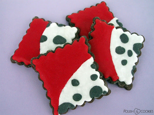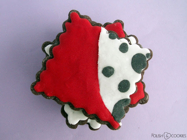 Czerwona część ciastek wykonana jest z zabarwionego lukru królewskiego. Najpierw oczywiście przykleiłam masę cukrową, a dopiero na koniec doprawiłam ciasteczka lukrem – nie odwrotnie!