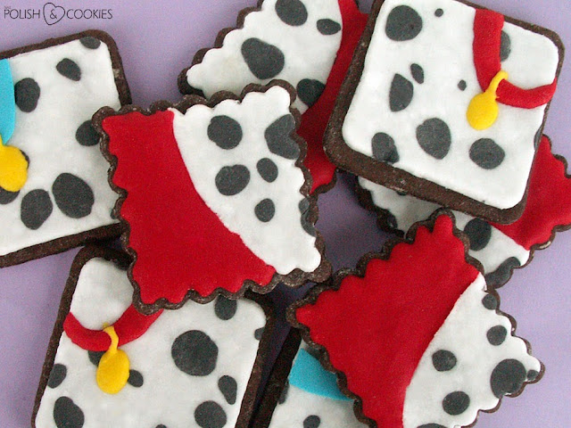Do przygotowania tych ciasteczek użyłam masy cukrowej, odpowiednio spreparowanej tak, aby przypominała skórę dalmatyńczyka. Dlatego też nie będę się już powtarzać z instrukcją, na pewno pamiętacie moje „wwałkoływanie psich kropek” :)