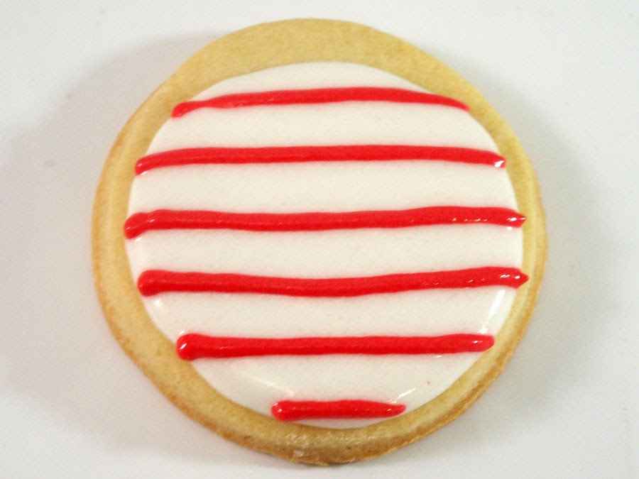 Cała tajemnica sukcesu tego zdobienia polega na mazaniu lukru „na mokro”, to znaczy od razu po nałożeniu go na ciastko. Ja najpierw pomalowałam ciasteczko na biało, następnie czerwonym lukrem dorobiłam poziome linie tak jak na zdjęciu poniżej: