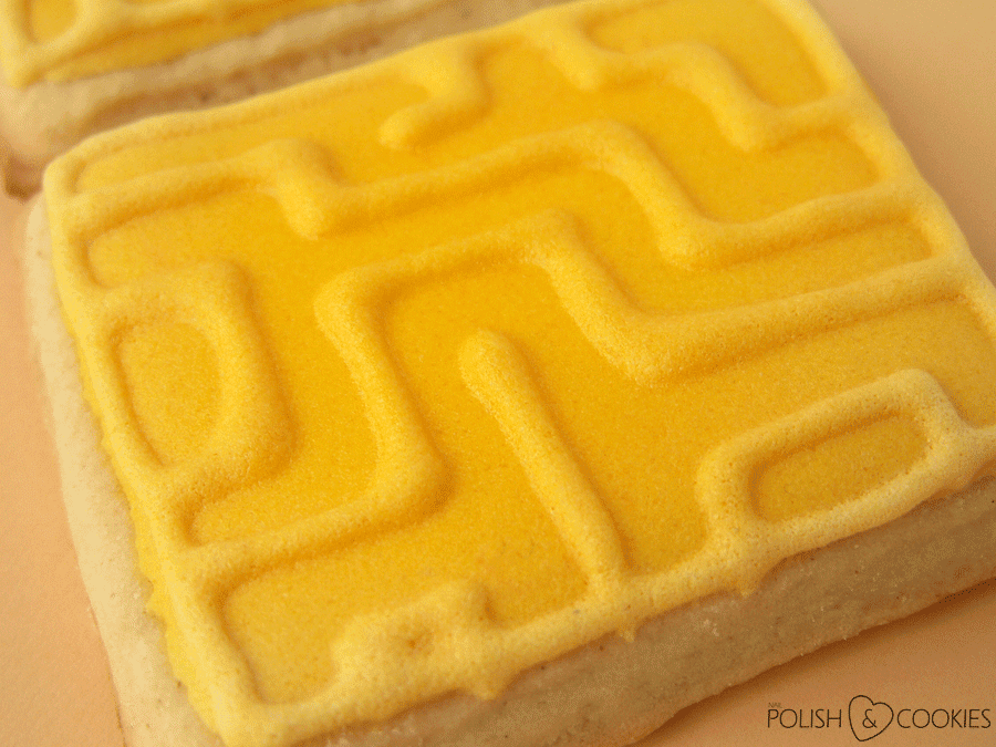 Aby stworzyć moje labirynty najpierw pokryłam jasnożółtym lukrem całe ciasteczko i pozwoliłam mu zupełnie wyschnąć. Później przy użyciu cienkiej końcówki do zdobień i tego samego żółtego lukru namalowałam pionowe i poziome linie w formie labiryntu i ponownie odstawiłam do całkowitego wyschnięcia.
