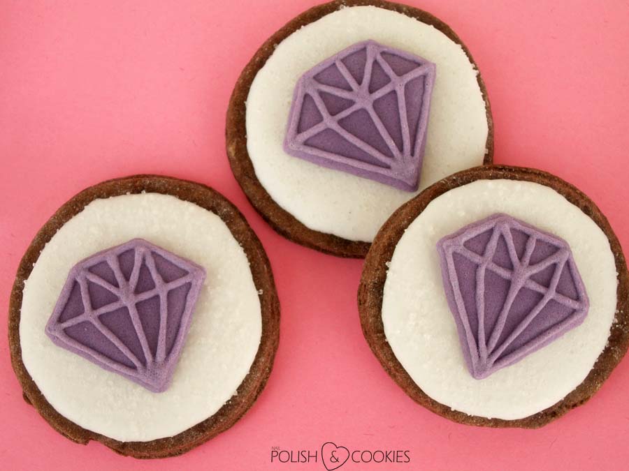 Aby zaoszczędzić sobie trochę czasu, moje diamenciki z fioletowego lukru przygotowałam sobie już wcześniej. O tej sztuczce pisałam Wam przy wykonywaniu moich niedawnych sówkowych ciasteczek – tym razem na papierze do pieczenia namalowałam najpierw kształt diamentów, a kiedy lukier wysechł namalowałam na nich jeszcze dodatkowo kontury „szlifów” przy pomocy cienkiej końcówki do dekoracji ciast i ciasteczek.
