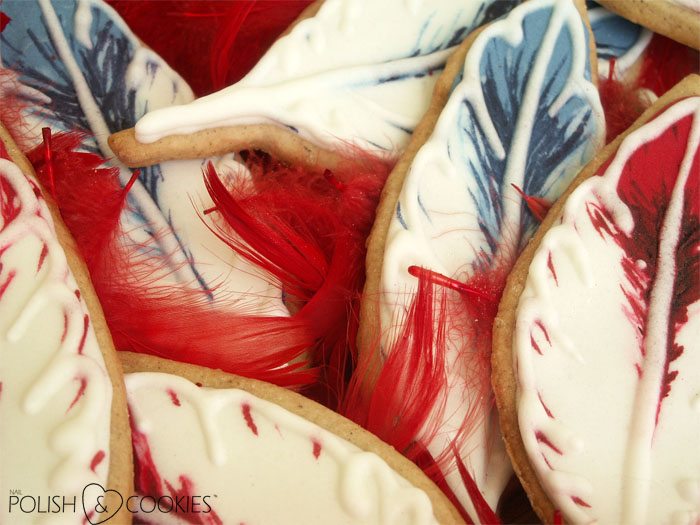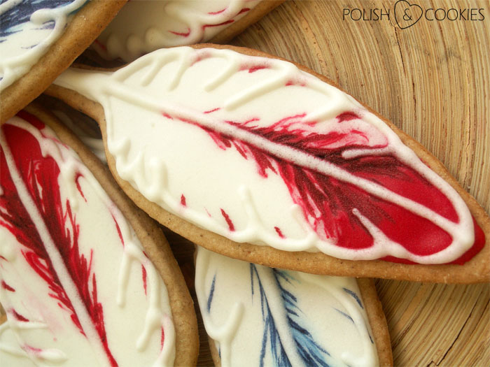 Aby nadać piórkom trochę faktury (po lekkim przeschnięciu lukru) cienkim pędzelkiem i rozcieńczonymi barwnikami spożywczymi namalowałam ciemniejsze fragmenty w górnej części ciastek. Na wierzchu obrysowałam krawędzie i trzon piórka gęstym białym lukrem, aby podkreślić ich kształt.