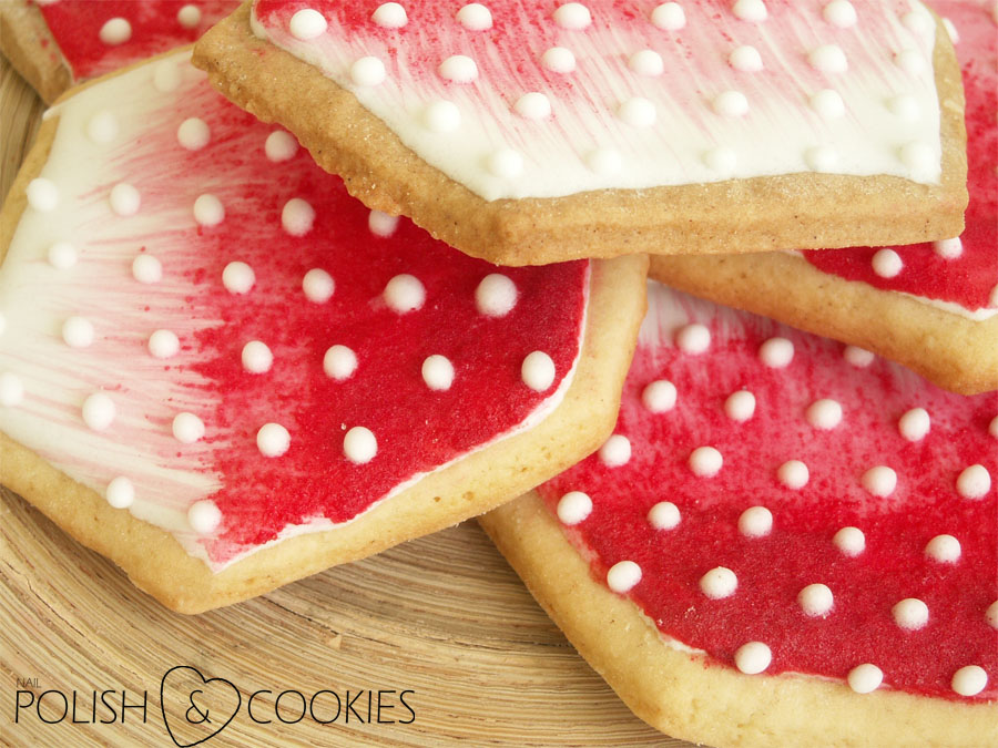 Rozpoczęłam pracę od polukrowania ciastek na biało i pozostawiłam je do całkowitego wyschnięcia na parę godzin. Efekt cieniowania uzyskałam przy pomocy szerokiego miękkiego pędzla. Technika ta jest bardzo prosta – do małej ilości kolorowego lukru (w moim przypadku ciemnoróżowego) dodałam trochę wody, dzięki czemu się znacznie rozrzedził i pędzlem pomalowałam pierwszą, jasną warstwę na powierzchni ok. 3/4 ciastka. Kiedy wyschło, dodalam więcej lukru i pomalowałam kolejną, ciemnejszą warstwę na 2/3 ciastka itd.. Wyglądało to mniej więcej tak: