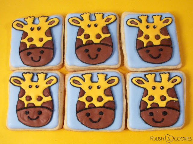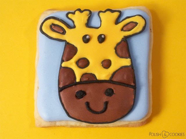 Aby wszystkie żyrafy wyszły identyczne wydrukowałam sobie najpierw szablon, podłożyłam go pod jasny papier do pieczenia i namalowałam wszystkie kontury czarnym gęstym lukrem i najcieńszą końcówką do dekoracji. Kiedy dobrze wyschły wypełniłam je odpowiednimi kolorami i pozostawiłam je na noc aby były zupełnie suche. Polukrowałam też ciastka błękitnym lukrem, a kiedy wszystko wyschło połączyłam oba elementy niewielką ilością lukru z poprzedniego dnia.