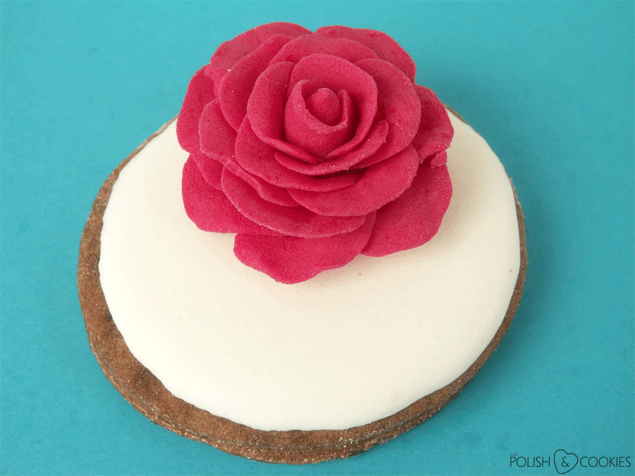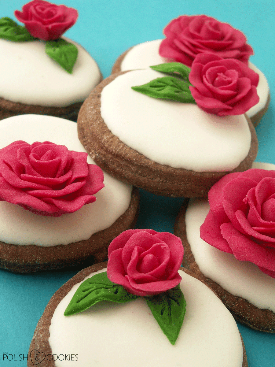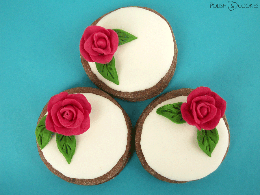 Ciasteczka upiekłam ze swojego sprawdzonego przepisu, do którego dodałam trochę kakao – dzięki temu nie były one aż tak słodkie i oczywiście zmieniły kolor na ciemnoczekoladowy. Aby nie odciągać uwagi od różyczek ciastka pokryłam tylko klasycznym białym lukrem królewskim i kiedy wyschły przy pomocy kropelki mokrego lukru przymocowałam do nich różyczki.