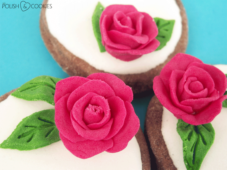 Upiekłam zarówno mniejsze jak i większe ciasteczka, dlatego też różyczki występują w dwóch rozmiarach. Duże pozostawiłam same sobie, natomiast do mniejszych dorobiłam na szybko jeszcze zielone listki z masy cukrowej. Która wersja Wam się bardziej podoba? Z listkami czy bez?