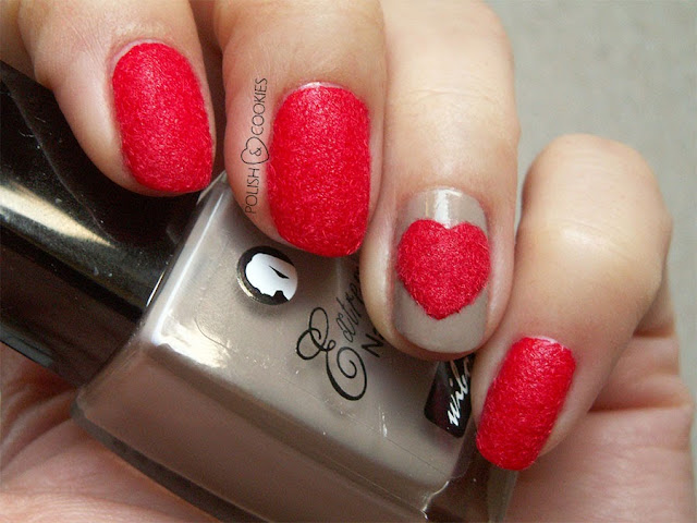 Po nałożeniu „sweterka” na czerwone paznokcie, z taśmy klejącej wycięłam dziurkę w kształcie serduszka i nakleiłam ją na szary paznokieć. Pozostałe miejsce wypełniłam czerwonym lakierem i „sweterkiem” i od razu oderwałam taśmę. Dzięki temu na paznokciu pozostał mi idealny kształt włochatego serca. Otrzepałam resztki paproszków z pozostałej części paznokcia i moje zdobienie było gotowe!