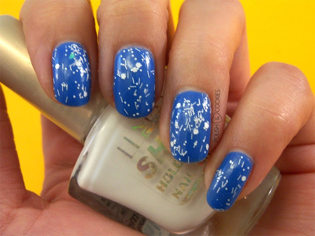 Jako tło całego zdobienia posłużyła mi ta cudowna kobaltowa miniaturka lakieru Lemax. Dodatkowo, podobnie jak przy moim PIERWSZYM ŚWIĄTECZNYM ZDOBIENIU z gałązkami ostrokrzewu, użyłam lakieru z małymi białymi drobinkami w różnych kształtach. Dzięki temu moje paznokcie zaczęły przypominać zaśnieżone nocne niebo ;)